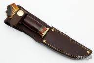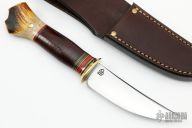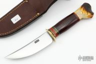 This Deer and Trout by Jim Behring features a satin finished covex ground blade with 0.103" blade stock and 1.045" blade depth, hidden tang construction. The handle has a brass guard, stacked horsehide leather grip with black/brass/red spacers. Vintage white tail  croch stag pommel. Comes with a brown leather sheath. New from maker.