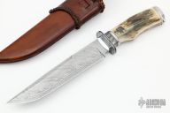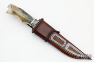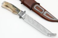 This Sole-Authorship Fighter by Michael Andersson features a 5-bar Damascus blade with 2 pure nickel stripes, false top edge, .172" blade stock and 1.569" blade depth, hidden/frame tang construction. The handle has a mirror polished stainless steel collar, fluted Damascus guard, mammoth ivory scales with a wood frame, stainless steel butt, fileworked and fluted stainless steel spacer. Comes with a beautiful brown leather sheath with Damascus accents. New from maker at the 2022 Blade Show.