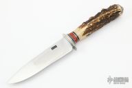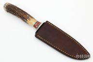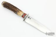 This Stainless Steel Kitchen Petty Knife by Jim Behring features a satin finished convex ground blade with .87" blade thickness and 1.165" blade depth, hidden tang construction. The handle has a nickel silver guard and cap, knarly sambar stag grip, with red/aluminum/black spacer pattern. Great look and feel. Comes with a brown leather sheath. New from Maker at the 2022 Blade Show.
