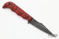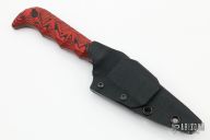 This Senator by Half Face Blades features a dark tumble finished blade with rock textured thumbrest, .146" blade stock and .816" blade depth, full tang construction. The handle has black/red G-10 scales with black pins. Comes with kydex sheath with belt clip. Excellent condition.
