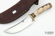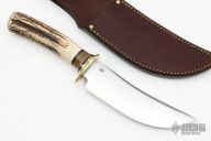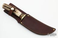 This Sable River Hunter by Jim Behring features a satin finished upswept convex ground blade with false top edge, .19" blade stock and 1.65" blade depth, hidden tang construction. The handle features a brass guard, black/micarta/red/yellow spacer pattern, finger grip sambar stag handle with domed musk ox butt plate. Great look and feel. Comes with full stitch brown leather sheath. New from maker.