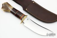 This Woodmonk Hunter by Jim Behring features a satin finished upswept convex ground blade with false top edge, .197" blade stock and 1.67" blade depth, hidden tang construction. The handle features a brass guard, black/micarta/red/yellow spacer pattern, horsehide stacked leather, vintage mule deer crotch stag with pinned and domed brass buttplates. Great look and feel. Comes with full stitch brown leather sheath. New from maker.