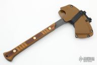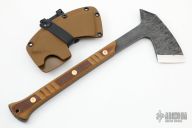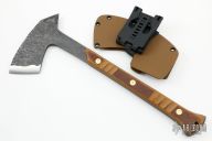 "The Cure" by Frank Landau features a hand forged head with a spike at the rear, forged finished flats, .266" blade stock, full tang construction with vintage paper micarta scales. Comes with a kydex sheath with TekLok. New from maker at the 2022 Blade Show.