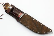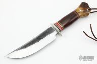 This Fighter by Jim Behring features a hammer mark finished upswept hollow ground blade with false top edge, .96" blade stock and 1.58" blade depth, hidden tang construction. The handle features a nickel silver guard, black/brass/red/yellow/aluminum spacer pattern, horsehide stacked leather, and pinned vintage mule deer crotch stag with aluminum lined thong hole. Great look and feel. Comes with full stitch brown leather sheath with premium giraffe hide panel. New from maker.