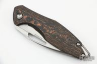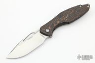 This Arius by Koenig knives features a tumbled finished blade with satin finished flats. The handle has a bead blasted and milled titanium frame, marble copper carbon fiber front scale, titanium backspacer and tip up clip with hidden screws. Has ceramic bearings and a ceramic detent ball. Nice detent, lockup and blade seating. Comes with original box and COA dated May 23, 2022. New from maker!
