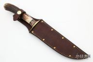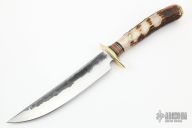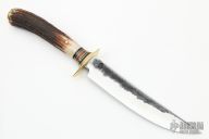 This Fighter by Jim Behring features a hammer finished upswept hollow ground blade with false top edge, .235" blade stock and 1.32" blade depth, hidden tang construction. The handle features a brass guard and butt, black/red/yellow/aluminum spacer pattern, pinned finger grip red stag. Great look and feel. Comes with full stitch brown leather sheath. New from maker.