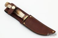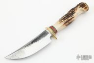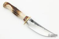 This Hunter by Jim Behring features a satin finished and hammer marked hollow ground blade with a false top edge, .231" blade thickness and 1.264" blade depth, hidden tang construction. The handle has a brass guard and cap, pinned sambar stag grip, black/brass/yellow/blue spacer pattern. Great look and feel. Comes with brown leather sheath.New from maker at the 2022 Blade Show.