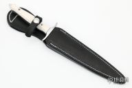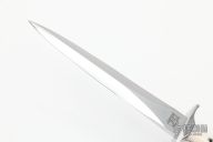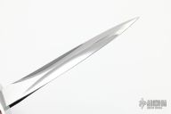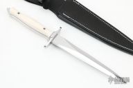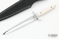 This Dagger by Walter Brend features a mirror polished double-edged blade, .273" blade stock and .939" blade depth, full tang construction. The handle has a mirror polished stainless steel guard with faux ivory scales, black liners and mosaic pins. Comes with a black leather sheath. New from maker at the 2022 Blade Show.