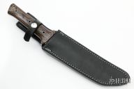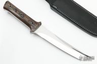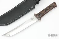 This 7.5" Tanto by Walter Brend features a multi-ground two-tone blade with satin flats and mirror polished grinds, sharpened top edge, .265" blade stock and 1.278" blade depth, full tang construction. The handle has a python canvas micarta scales, with lanyard hole. Comes with a black leather sheath by Byrd's Leather. New from maker at the 2022 Blade Show.