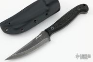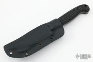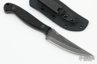 This Phantom by Frank Landau III features an acid washed blade with false top edge and notched thumbrest, .179" blade stock and 1.045" blade depth, full tang construction. The handle textured black richlight scales with black screws. Comes with a C4 Industries kydex sheath with clip. New from maker at the 2022 Blade Show.
