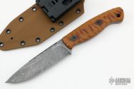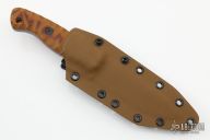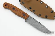 This Hunter by Frank Landau III features an acid washed blade with a textured spine, .157" blade stock and 1.204" blade depth, full tang construction. The handle textured vintage paper micarta scales with black screws. Comes with a C4 Industries kydex sheath with TekLok. New from maker at the 2022 Blade Show.