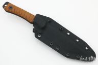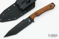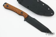 This Angry Man Tanto by Frank Landau III features a black tanto blade with a notched thumbrest, .222" blade stock and 1.204" blade depth, full tang construction. The handle textured vintage paper micarta scales with black screws. Comes with a C4 Industries kydex sheath with TekLok. New from maker at the 2022 Blade Show.