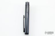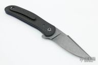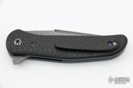 This Chiron from Bruce Bingenheimer features a stonewashed harpoon style drop point blade with false top edge and flipper. The handle is comprised of carbon fiber scales over anodized titanium liners and carbon fiber backspacer. Carbon fiber tip up carry pocket clip. Great blade seating, detent and lock up. Excellent condition.