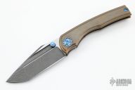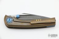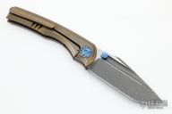 This BBM V2 by Nick Chuprin and Robert Carter features a two-tone blade with acid-wash and satin flats with titanium thumbstuds. The handle has a milled titanium frame with tumbled and anodized finishes (cracked ice), two pice titanium pivot, matching backspacer and tip up clip with hidden screws. Rides on Skiff Made bearings, nice detent, lockup and blade seating. Comes with a zippered case. New from maker.
