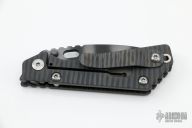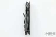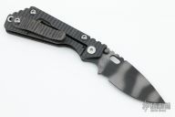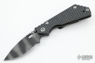 This PT by Mick Strider features a tiger stripe finish blade with notched thumbrest and thumbhole. The handle has a flame finished titanium frame with matching tip up clip. Excellent condition.