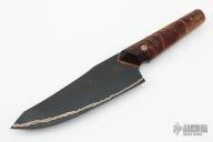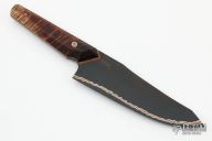 This Gyuto by Kanaloa Custom Knives features a 1084/Copper Dion Damascus blade with .135" blade stock and 2.198" blade depth, full tang construction. The handle has copper liners and a beautiful wood grip with mosaic and copper pin. Comes with a zippered case and COA. New from maker at the 2022 Blade Show.