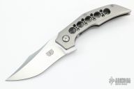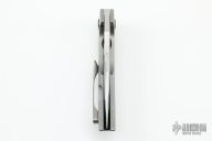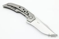 This Die Hard by Tashi Bharucha features a hand rub satin finished blade with flipper. The handle has a bead blasted titanium frame with matching tip up clip. Zirconium pivot collars and backspacer. Rides on bearings, nice detent, lockup and blade seating. Comes with zippered case and dog tag. New from Maker at the 2022 Blade Show.