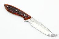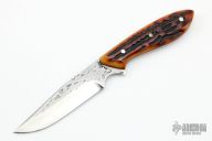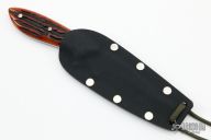 This neck knife by Murray Carter features a laminated blade with polished grinds, forged finished flats and a tapered tang construction.  .111" Blade Stock.  .886" Blade Depth.  The handle features amber stag scales.  Includes a kydex sheath.  Excellent Condition.