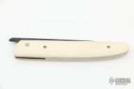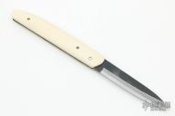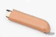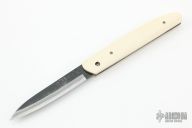 The Bitchu-no-Kami is a traditional Japanese-style folder. The blade is Stainless clad Aogami Super Steel (NAS) which is a high-carbon steel alloy with vanadium and is ground on both sides. Handle constructed of micarta scales with polished stainless steel liners and backspacer. Comes with brown leather pouch.  Excellent condition.