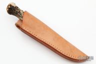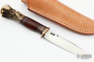 This Scagel Style Hunter by Joe Holbert features a satin finished blade with .115" blade stock, .798" blade depth, hidden tang construction. The handle has a brass guard, stacked leather grip and a stag pommel. Includes a brown leather sheath. Has been resharpened otherwise the knife is in excellent condition.