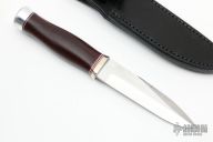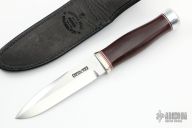 This Gambler by Randall Made Knives features a satin finished blade with .211" blade stock and 1.105" blade depth, hidden tang construction. Sharpened top edge. Notched thumbrest. Black linen micarta grip with nickel silver guard, red/white/blue spacers, duralumin butt. The Gambler is one of Randall's non-catalog knives. Comes with a black leather sheath and original paper wrapping. New from maker.