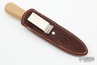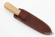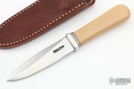 This Model 24 Guardian by Randall Made Knives features a satin finished double-edged blade with notched finger rests, .162" blade stock and .965" blade depth, hidden tang construction. Ivory paper micarta grip with black/duralumin spacers and a nickel silver guard. Both edges of the blade are sharpened with 1" of thumb notches. This model was designed in 1978 for use by police, undercover agents and law enforcement personnel for self-protection and as a back-up weapon. Comes with a brown leather sheath w/ boot clip and original paper wrapping. New from maker.
