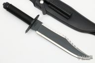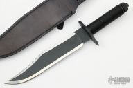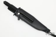 This knife features a two-tone blade with black center and satin finished grinds, 14 saw-teeth on blade spine and sharpened top edge, .258" blade stock and 1.825" blade depth, hidden tang construction. The handle has a black stainless steel double guard with flat and Phillips head screwdrivers, hollow cord wrapped handle, and aluminum removable butt cap with a compass and an O-ring to make it waterproof. Comes with black leather sheath with a diamond sharpener in the sheath and a Lile zippered case. Designed by Jimmy Lile and made by Vaughn Neeley. New From Maker!