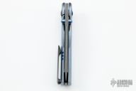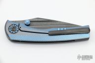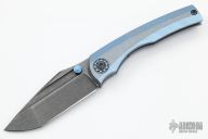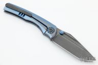This BBM V2 by Nick Chuprin and Robert Carter features an acid wash tumble finish blade with fullers, dual anodized thumbstuds and milled bevels. The handle has a 'cracked ice' finish milled titanium frame, zirconium two piece pivot, backspacer and tip up clip with hidden screws. Rides on bearings, nice detent, lockup and blade seating. Comes with a zippered case. New from maker.