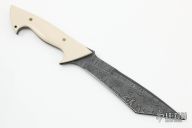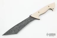 This Retribution by Alex Hossom features a Damascus blade with sharpened top edge and notched thumbrest, .158" blade stock and 1.685" blade depth, full tapered tang construction. The handle has ivory paper micarta scales with mosaic pins and green/black G-10 liners. Comes with a zippered case. New from maker at the 2022 Blade Show.