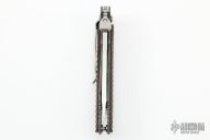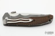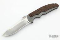 This Devastator by RJ Martin features milled bevel blade with notched thumbrest and a thumbdisc. The handle has 2 deep finger grooves that provide positive indexing in both forward and reverse grips. Deep traction grooves on blade spine anchor the thumb, but don't hang up on your pocket during deployment. CNC Textured black/orange G-10 scales for maximum grip-ability. Ambidextrous textured Titanium thumb stud for slip-free blade opening. The .090 thick bead blasted titanium frame is rigidized by 4 precision Ti standoffs and a massive 3/16 diameter Hardened Stainless stop pin. Has a couple light scuffs, otherwise excellent condition. Nice detent, lockup and blade seating.