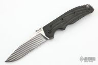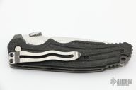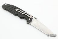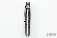This Avenger by RJ Martin features milled bevel blade with notched thumbrest and a thumbdisc. The handle has 2 deep finger grooves that provide positive indexing in both forward and reverse grips. Deep traction grooves on blade spine anchor the thumb, but don't hang up on your pocket during deployment. CNC Textured carbon fiber scales for maximum grip-ability. Ambidextrous textured Titanium thumb stud for slip-free blade opening. The .090 thick bead blasted titanium frame is rigidized by 4 precision Ti standoffs and a massive 3/16 diameter Hardened Stainless stop pin. Has a couple light scuffs, otherwise excellent condition. Nice detent, lockup and blade seating.