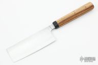 This custom Nakiri by Nate Summers features a hand rub satin finish blade with hidden tang construction, .158" Blade Stock and 1.7" Blade Depth. The handle features a wood grip with a black canvas micarta ferrule. New from maker!