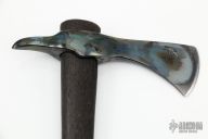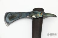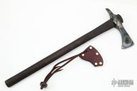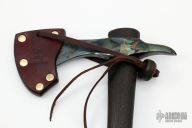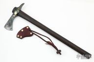 This Spike Tomahawk by Robert Lindsey features a color case hardened head with spike pole. Has an 18.5" fire hardened hickory handle. Has leather edge sheath with wood bead tightener. New from maker at the 2022 Blade Show. He's been making these a long time and they are fantastic!