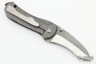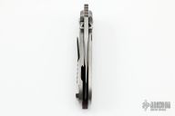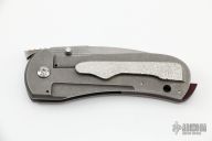 This Osprey by Jon Hayes features a satin finished blade with dual thumbstuds and notched front flipper. The handle has a milled and textured titanium frame with a maroon canvas micarta backspacer and a textured tip up titanium clip with hidden screws. Comes with zippered case and COA dated 5/22. New from maker at the 2022 Blade Show.