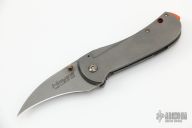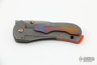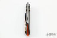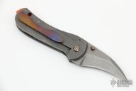 This Osprey by Jon Hayes features a tumble finished chisel ground blade with dual thumbstuds and notched front flipper. The handle has a milled and tumbled titanium frame with an orange G-10 backspacer and an anodized tip up titanium clip with hidden screws. Comes with zippered case and COA dated 5/22. New from maker at the 2022 Blade Show.