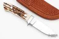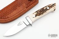This Drop Point Hunter by Gary Martindale features stag scales with red liners and a mirror polished stainless steel guard. Full tapered tang construction with .190" blade stock and 1.079" blade depth. Mirror polished blade. Includes a hand tooled brown leather sheath with belt loop and a zippered case. Brand new from maker at the 2022 Blade Show. #141 on blade. Gary's knives are incredible and this one is no exception.