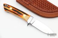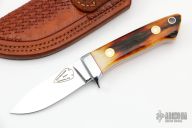 This Small Drop Point Hunter by Gary Martindale features amazing stag scales with red liners and a mirror polished stainless steel guard. Full tapered tang construction with .179" blade stock and .853" blade depth. Mirror polished blade. Includes a hand tooled brown leather sheath with belt loop and a zippered case. Brand new from maker at the 2022 Blade Show. #146 on blade. Gary's knives are incredible and this one is no exception.