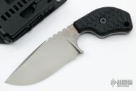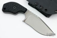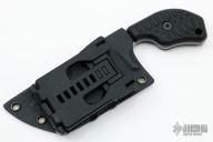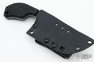 This SLCC by Mick Strider features a black drop point recurve blade with a notched thumbrest. .152" blade stock and 1.479" blade depth. The handle has a finger groove and ring. Has black G-10 scales, from VZ Grips. Comes with a kydex sheath with teklok. Has some sheath marks on the blade, otherwise excellent condition.