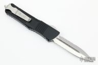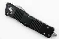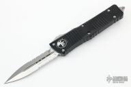 This Combat Troodon OTF automatic by Microtech knives features a satin finished double edged blade with partial serrations, and a black aluminum handle with bead blasted hardware, tip down carry. Glass breaker. S/N 37393. Dated 02/2022. Comes with original box and papers. Excellent condition.