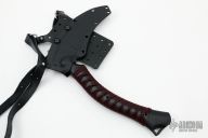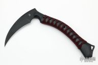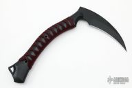 The ReaperTAC from Bastinelli Creations is one cool tool. It's a tactical version of a scythe, an old school tool for reaping crops that has long since been replaced by heavy machinery throughout much of the world. This variation is like a tomahawk in its tactical usage however it incorporates none of its utility functionality. The ReaperTAC measures 9.45" overall with a 6.7" Bohler N690Co stainless steel blade. The recurved shape allows this blade to rip and tear like an elongated talon and the design tapers toward the tip to allow ample penetration power from such a unique tool. The ergonomic handle is made from contoured black G10 allowing a sure grip at the base or top of the handle. The ReaperTAC includes a kydex and leather shoulder sheath.  New from maker.