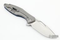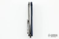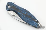 This Arius by Koenig knives features a brightwashed blade with satin finished flats. The handle has a bead blasted and milled titanium frame, marbled blue carbon fiber front scale, titanium backspacer and tip up clip with hidden screws. Has ceramic bearings and a ceramic detent ball. Nice detent, lockup and blade seating. Comes with original box and COA dated May 24, 2022. New from maker at the 2022 Blade Show.