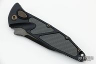 This Signature Series Socom Elite Auto by Microtech has a DLC stonewashed blade with notched thumbrest. Black aluminum handle with carbon fiber inserts. Stainless steel clip, tip down carry. Glass breaker. Dated 01/2020 and s/n 679. Comes with original box and papers. Excellent condition.