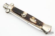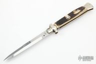 This large Swivel Bolster from A.G.A. Campolin features a mirror spear point blade with false top edge. The handle is comprised of nickel silver bolsters and pommel with stag scales over brass liners and stainless steel backspacer. Excellent condition. Comes with a zippered case.