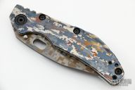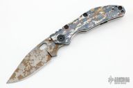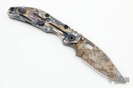 This DDC BBNL Framelock Folder has a DigiCam V-ground blade with dual thumbstuds and thumbhole. Handle has a DigiCam titanium frame and tip up clip, and titanium barrel spacers, black hardware. Centered blade and great lockup and detent with zero blade play. Comes with a Velcro case and COA. New from maker.