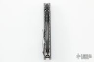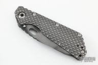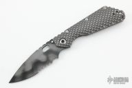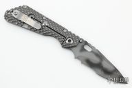 This SMF DGG by Mick Strider has a tiger striped Trisula Ground partially serrated blade with dual thumb studs, thumb hole, and notched thumbrest. The handle has a double Gunner Grip titanium frame, with lockbar stabilizer, and titanium tip up clip, left right reversible. New condition. Nice detent, lockup and blade seating.