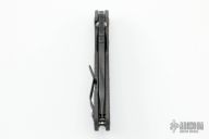 This SMF DGG by Mick Strider has a tiger striped Trisula Ground partially serrated blade with dual thumb studs, thumb hole, and notched thumbrest. The handle has a flamed titanium frame, with lockbar stabilizer, and titanium tip up clip, left right reversible. New condition. Nice detent, lockup and blade seating.