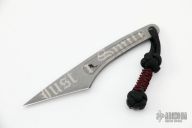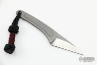 This Kiridashi from Bastinelli Knives features a tumble finished chisel ground blade with swedge and notched thumb rest. The handle is comprised of full tang construction. Exposed tang with lanyard hole and lanyard on pommel. Includes kydex neck sheath and padded and hard case. New from Maker!