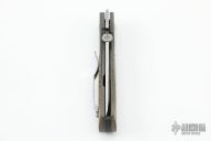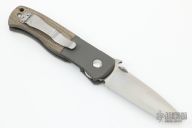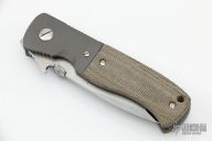This Custom CQC-7 by Emerson Knives features a chisel ground satin finished tanto blade with notched thumbrest, wave feature and thumbdisc. The handle has bead blasted and dovetailed titanium bolsters, green canvas micarta scales, bead blasted titanium liners, black G-10 backspacer, tip up stainless steel clip. Comes with original box. New from maker at the 2022 Blade Show.
