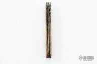 This sole authorship liner lock folding knife by Master Smith Don Hanson III features a Mosaic Damascus blade with a single gold thumbstud. The handle Mosaic Damascus bolsters, mammoth ivory scales, fileworked and anodized titanium liners, Damascus backspacer. Nice detent, lockup and blade seating. Excellent condition.