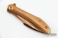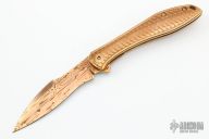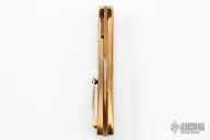 This Mongoose by Jerry Moen features a gold DLC Damasteel recurve blade with notched flipper. The handle has a milled and gold DLC titanium frame with copper backspacer and gold DLC tip up clip with ceramic ball insert, gold DLC titanium hardware. Has an inlaid gold DLC titanium liner, rides on bearings, nice detent, lockup and blade seating. Comes with a zippered case and COA #6. Excellent condition.